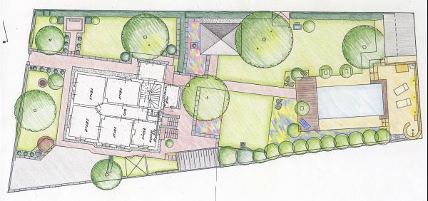 Der nicht allzu große Garten um eine kleine Jugendstil-Villa sollte komplett umgestaltet werden. Verschiedene Sitzplätze waren gewünscht - kleine und große - und vor allem wollten die Auftraggeber einen Swimmingpool. Wegen des schräg nach hinten fallenden Geländes war es nötig v.a. im Osten, aber auch im Süden massive Stützmauern zu errichten. Damit diese Mauern im Osten nicht zu hoch werden, wurde der Sitzplatz hinter dem Pool (vom Haus aus gesehen) drei Stufen tiefer gelegt. Erhalten werden mussten ein sehr großer und ein kleinerer Walnussbaum.