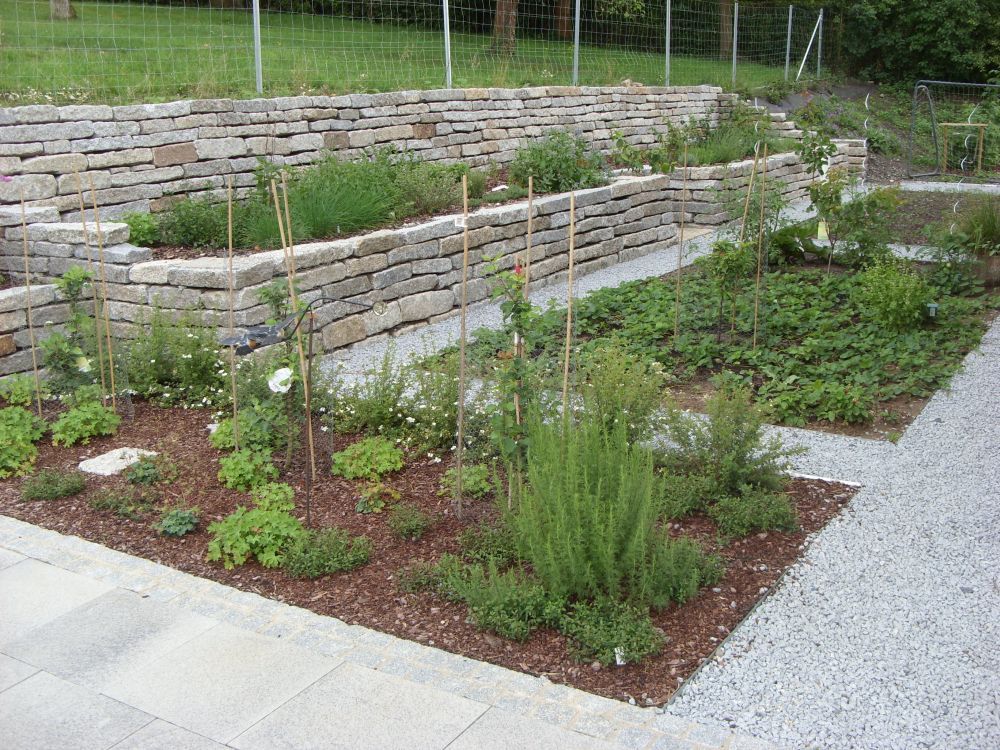 Die besondere Herausforderung lag in der Befestigung der teils sehr steilen Böschungen (Aufschüttungen) bzw. der teils großen Höhenunterschiede (Abgrabungen). Aber auch der Keuperboden mit einer nicht sehr tief liegenden Stauschicht (durch die Abgrabungen im oberen Grundstücksbereich fast zutage gebracht) verlangten nach passenden Lösungen.