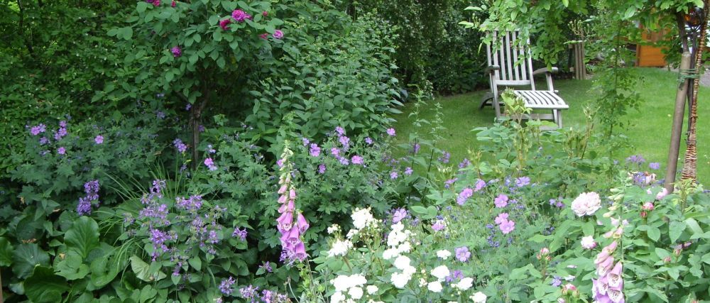 Der umzugestaltende Hausgarten war vormals v.a. ein Obstgarten gewesen. Die jetzigen Besitzer sind Gärtner aus Leidenschaft und sie lieben Rosen.