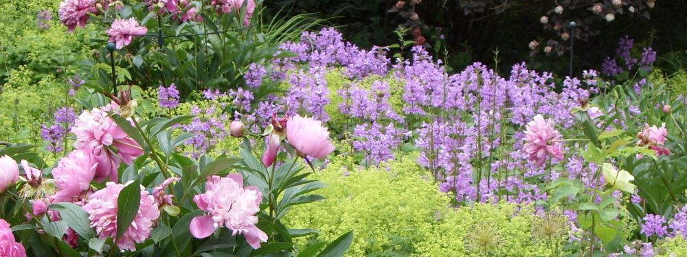 Die sichtbaren Bereiche des Gartens liegen im Süden und Westen (Terrasse). Hier entstanden großflächige Staudenpflanzungen, mit einigen Strauchrosen und Sträuchern durchsetzt, sowie ein kleiner Teich. Die Pflanzungen vermitteln eine Üppigkeit und Fülle.